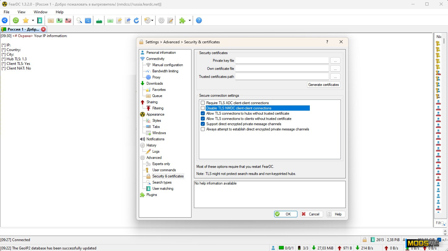 FearDC is an open source Windows client for Direct Connect network. It is based on DC++ - the original client, but implements more features both for the user and the protocol. Main feature of this fork is the TLS-encrypted connection support for NMDC hubs. It allows you to connect to NMDC TLS-enabled hubs securely, using a TLS-encrypted channel. This feature is crucial because the protocols themselves, either NMDC or ADC, are plain text protocols that can easily be scanned and even logged by your ISP or third parties.